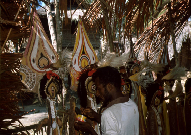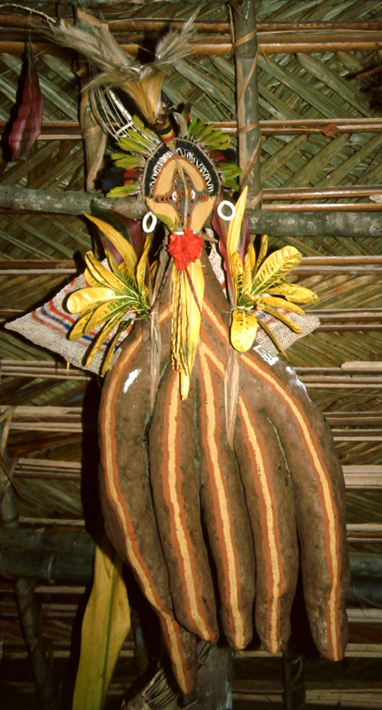 At harvest time the largest and longest of the yams of each clan is decorated with wooden or cane masks, painted with red, yellow, black and white