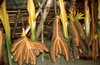 Usually the long yams are tied to poles and displayed on the place in front of the cult house. The men who have grown them exchange their yams with a partner